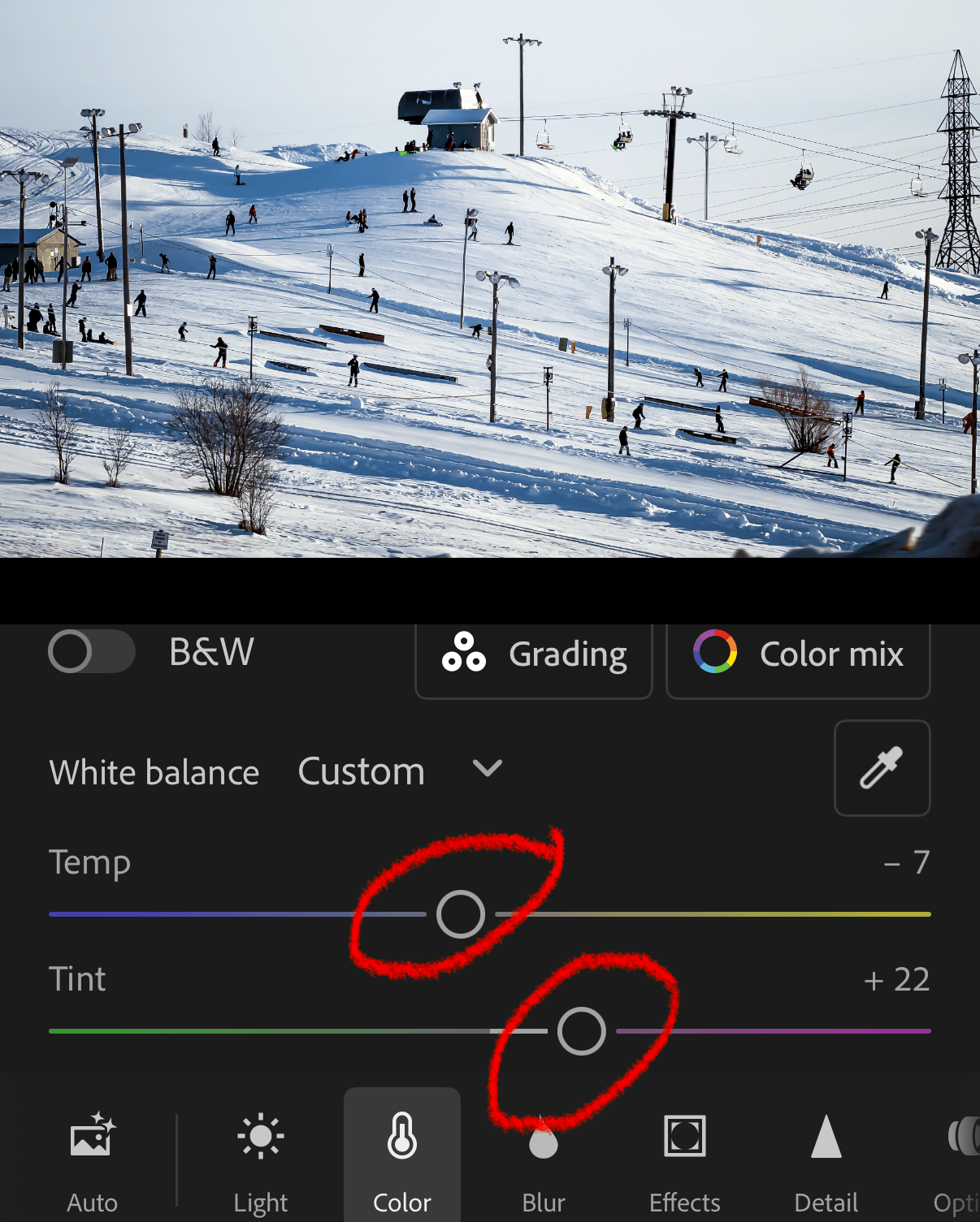 3. Colour correct for tinted car windows. Glass can be tinted a certain colour, and it can affect your photo. I noticed that my car window has a yellow-green hue to it. Especially when I take photos of snow, the colours come out off. To correct this, I use the Temperature and Tint sliders in Lightroom Mobile to correct the hue. I add a bit more blue and a lot more magenta to fix it.