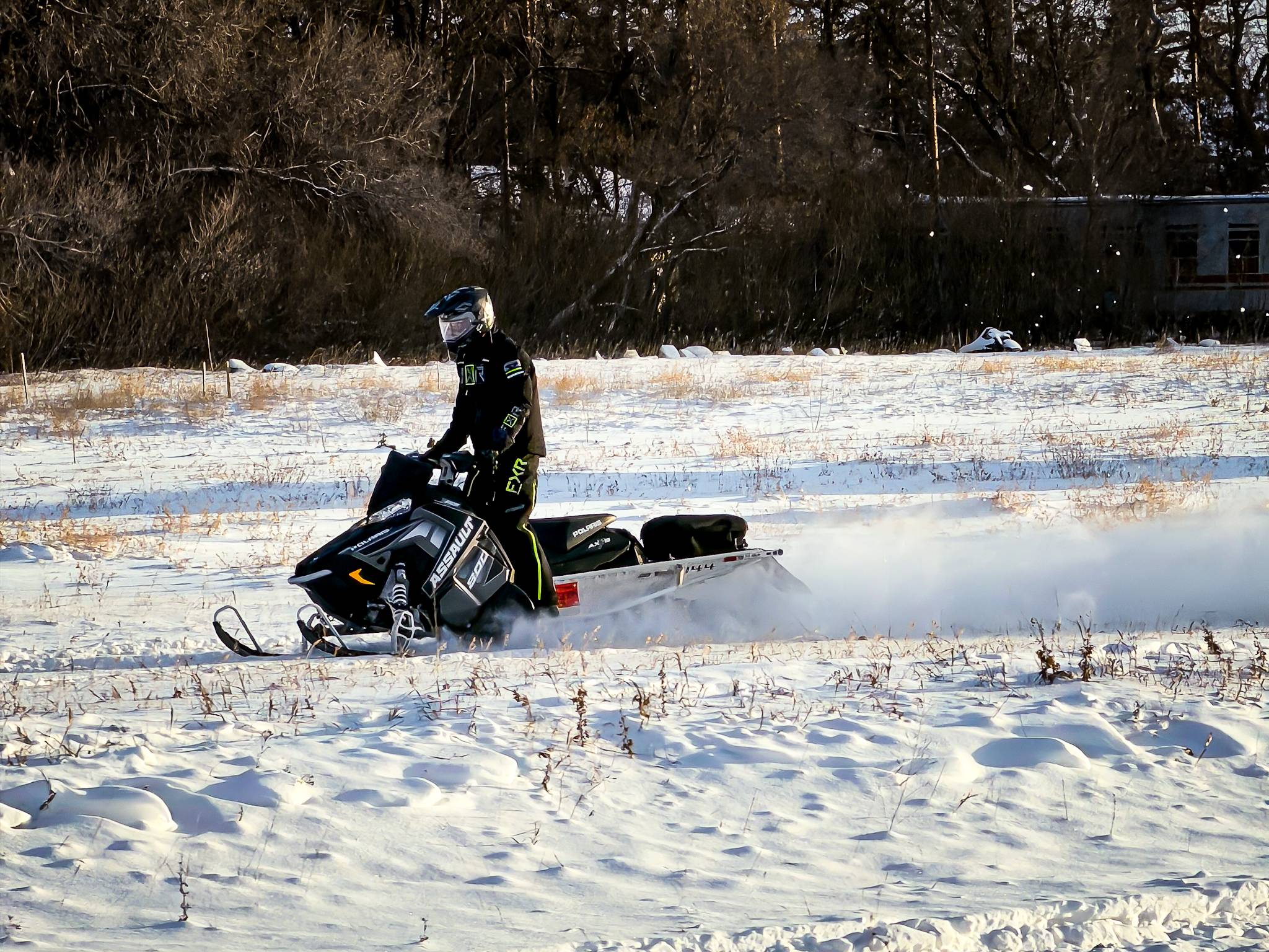 I was trying to catch photos of snowmobilers on the side of the highway. I zoomed in too much and missed part of this shot - just when it would have been at the perfect moment of this pop wheelie!